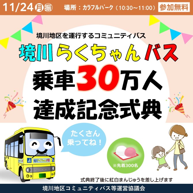 境川地区を運行する地域コミュニティバス「境川らくちゃんバス」の乗車30万人を記念して、式典を実施します!