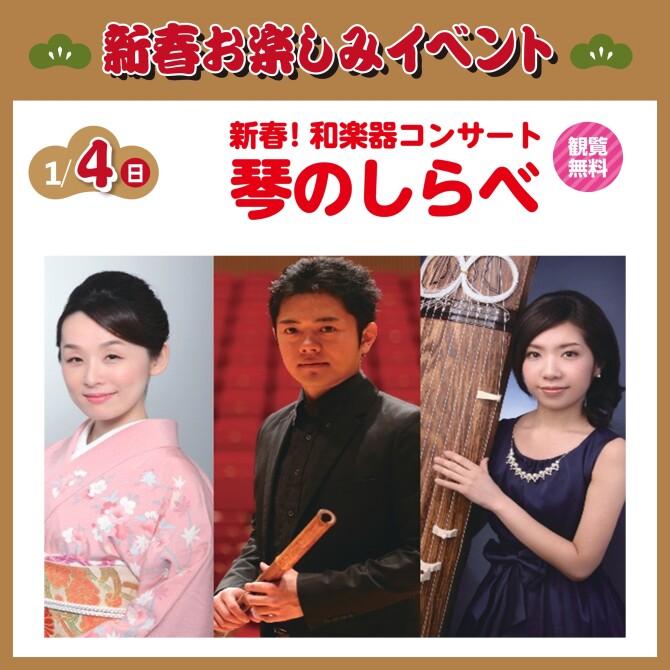 \新春お楽しみイベント第4弾!/ 箏(こと)と尺八の和楽器演奏者たちによる、特別コンサートを開催🎶お正月ならではの曲やお子さまにも楽しめる楽曲を演奏します。美しい和の響きをお楽しみください。