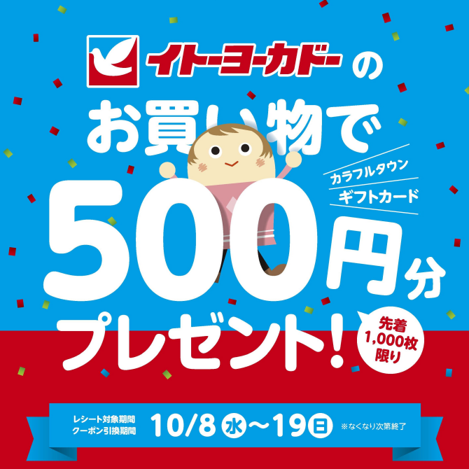 イトーヨーカドーのお買い物でオトク!期間中の引換当日分のイトーヨーカドー柳津店でのお買い上げ税込3,000円(合算不可)以上のレシートと8日に配信されたクーポンのご提示でカラフルタウンギフトカード500円分1枚プレゼント🎁