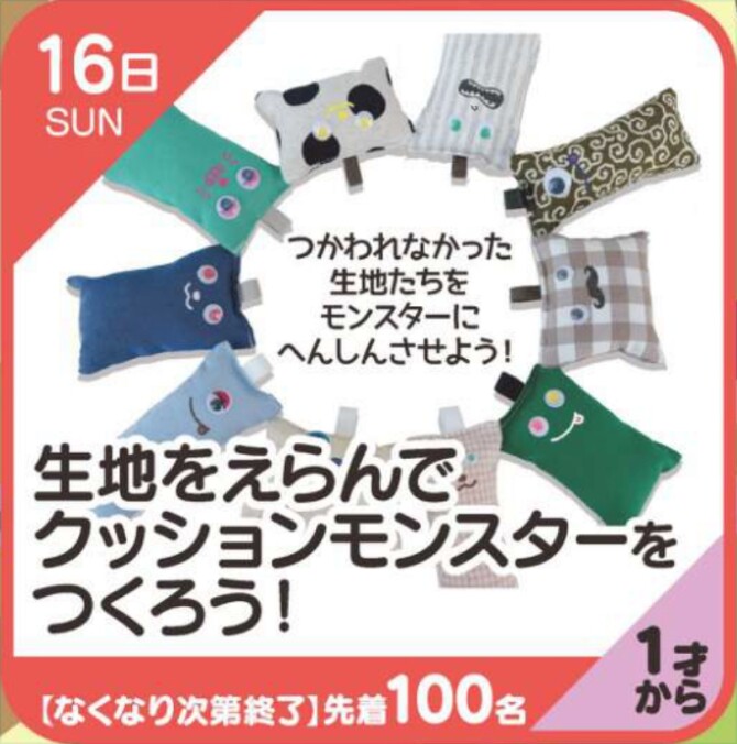 【キッズクラブ】生地をえらんでクッションモンスターをつくろう!